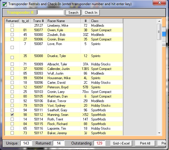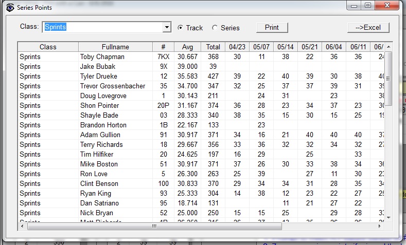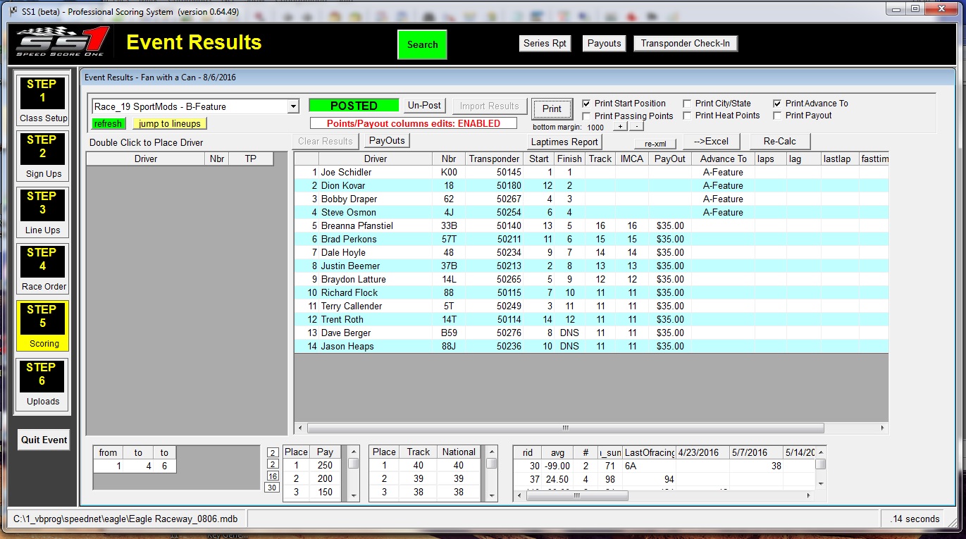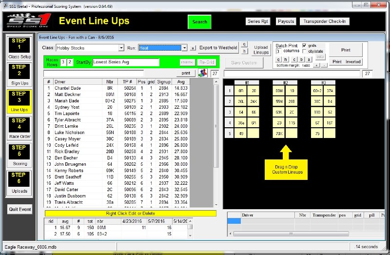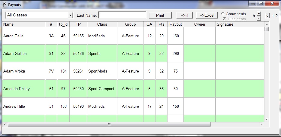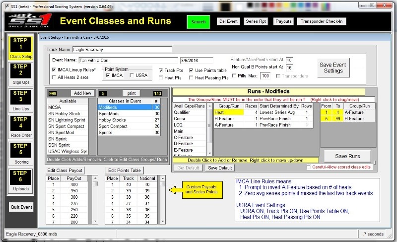 Event Setup, Sanction Points, Payouts Classes, Groups Runs, Heats, Rows